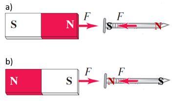 In our common impressions, a magnet is an object that will emit magnetic field and attract an iron body, such as a nail. In a general sense, the nail is also a magnet, however the polarity of which will alternate easily. As illustrated in Fig. 1a), when a magnet’s North pole is approaching to the head of a nail, a South pole will appear in the head of the nail and, correspondingly, a North pole will appear in the tail of the nail. Because unlike poles attract to each other, the nail is attracted to the magnet. When we turn around the magnet to make its South pole against the nail, as illustrated in Fig 1b), the nail will still be attracted to the magnet, rather than be repelled away as the result of like poles repelling each other. This is because the polarity of the nail has been changed by the turning of the magnet, now the head of the nail is North pole, and the tail of the nail is South pole. Because the magnetism is obedient to external field, the nail and other objects made by iron are termed as soft magnets.